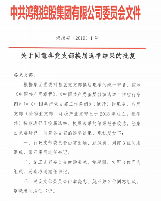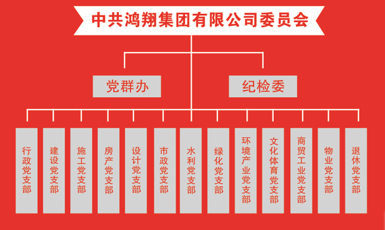 中共鸿翔控股集团有限公司委员会截止2019年1月,共有党员176名,预备党员6名,其中入党积极分子15名。党员平均年龄:43岁,大专及本科以上学历123人,占党员总数的80.9%;中级以上职称62人,占党员总数的40.8%,中层干部占党员总数的75%。