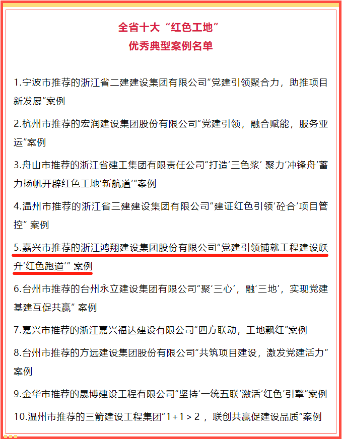为进一步加强建筑业基层党建工作,打造浙江建筑业党建品牌,在党的生日即将来临之际,浙江省建筑业管理总站开展了“红色工地”十大典型案例征集活动。鸿翔建设集团选送的白领氏环球贸易中心项目工作案例《党建引领铺就工程建设跃升“红色跑道”》,在5月底成功入选复赛入围名单。6月9日,省建设厅组织召开全省“红色工地”优秀典型案例展示交流会,展示交流全省建筑业基层党建工作好案例好经验好做法。鸿翔集团选送的这一工作案例一路过关斩将,最终荣列全省“红色工地”十大典型案例第五位。