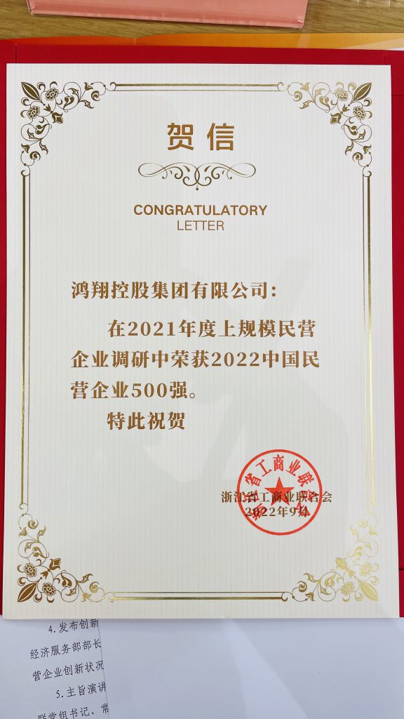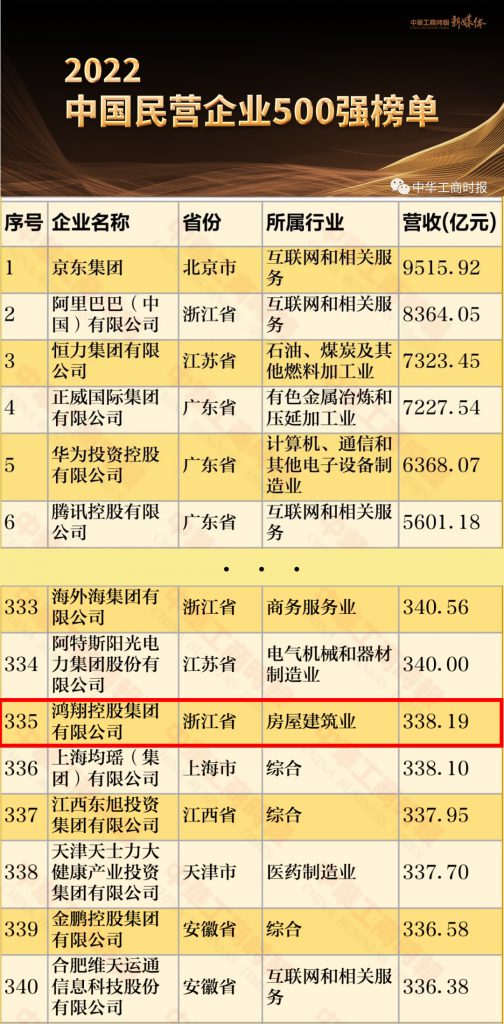9月7日,全国工商联以线上线下相结合方式举办2022中国民营企业500强峰会,会上发布《2022中国民营企业500强榜单》。鸿翔集团凭借稳健的高质量发展,蝉联榜单,排名第335位,较2021年上升28位。