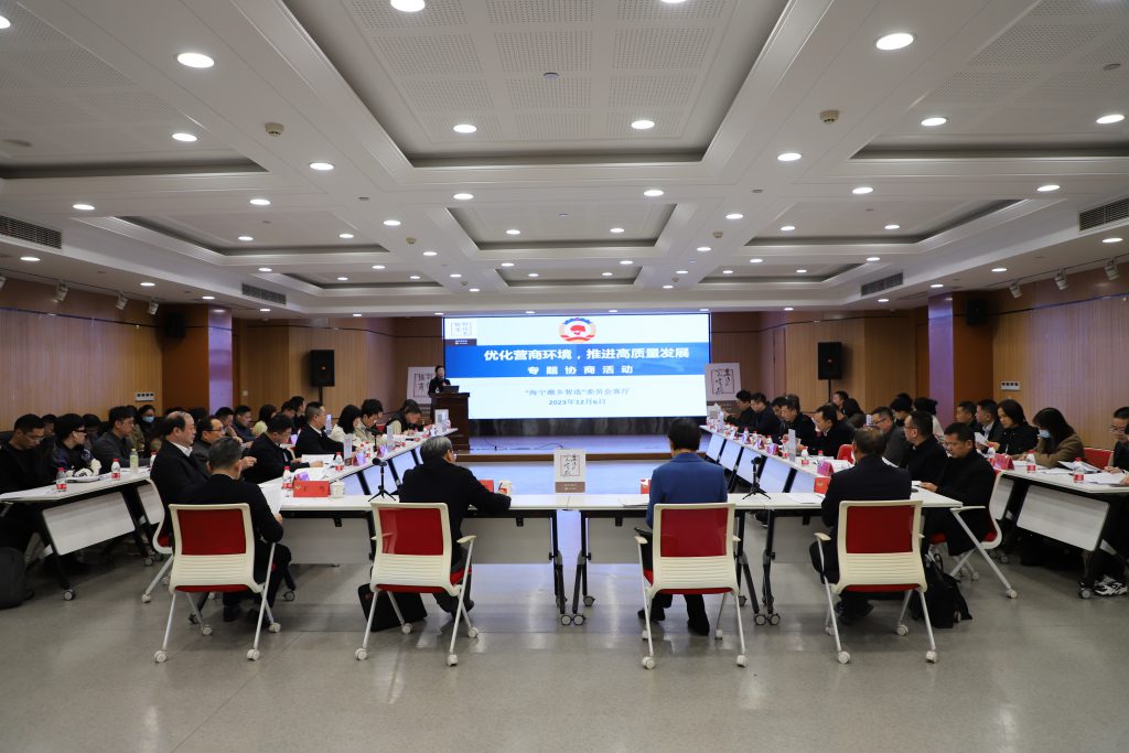 12月6日,“潮乡智造”政协委员会客厅举行“优化营商环境,推进高质量发展”专题协商会,嘉兴市政协副主席盛全生,海宁市政协主席周红霞,海宁市委常委、常务副市长王一鸣,海宁市政协副主席王建坤等参加协商会。活动由会客厅牵头委员姚惟秉主持。